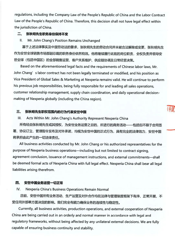 四、安世中国业务运营一切正常,目前,安世中国所有业务活动、生产运营及对外合作均在法律与管理制度框架下有序、正常开展,不受任何外部单方面决定的影响。我们完全有能力确保业务的连续性与稳定性。